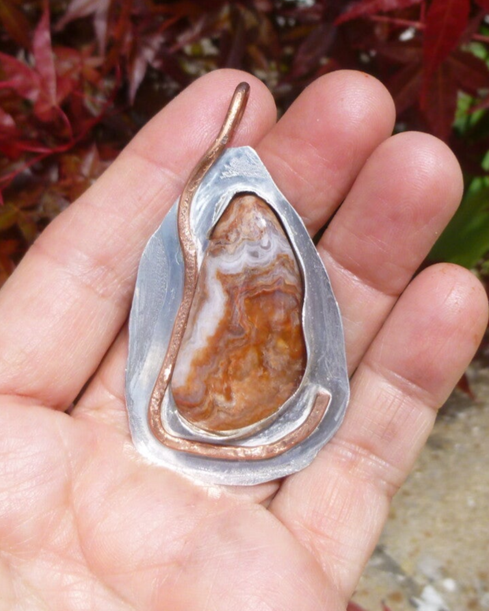 Pendentif original avec une belle agate sertie dans une bande en argent 925 et placée par soudure sur une plaque d'argent 925. Pour l'habiller, je l'ai entourée d'un fil rond en bronze.
