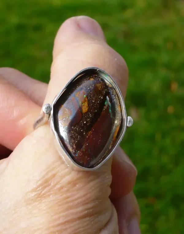 Grande bague avec une magnifique opale boulder véritable. Elle est magnifique, elle contient des formes de différentes couleurs (acajou, brun moyen avec des petits points crème et vert clair, brun foncé). Elle scintille au soleil de petites feux verts.