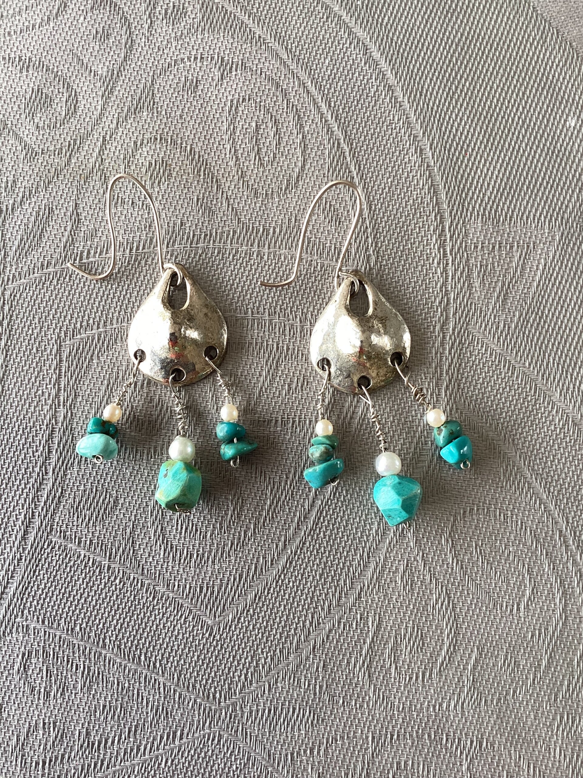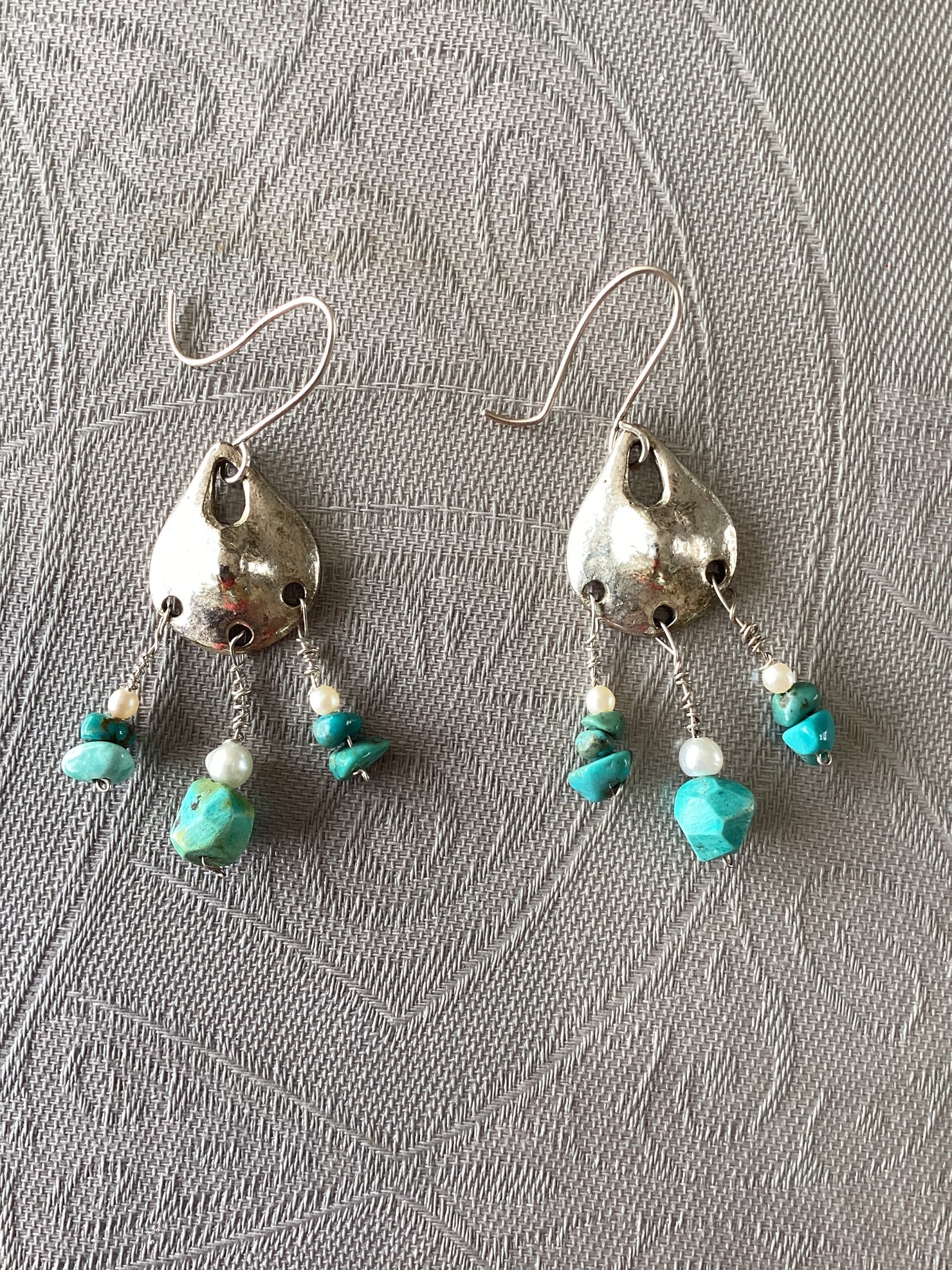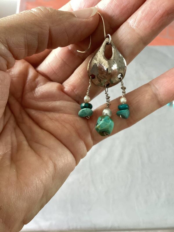 Jolies boucles pendants d'oreilles avec vėritables turquoises et petites perles blanches. crochet en argent 925.