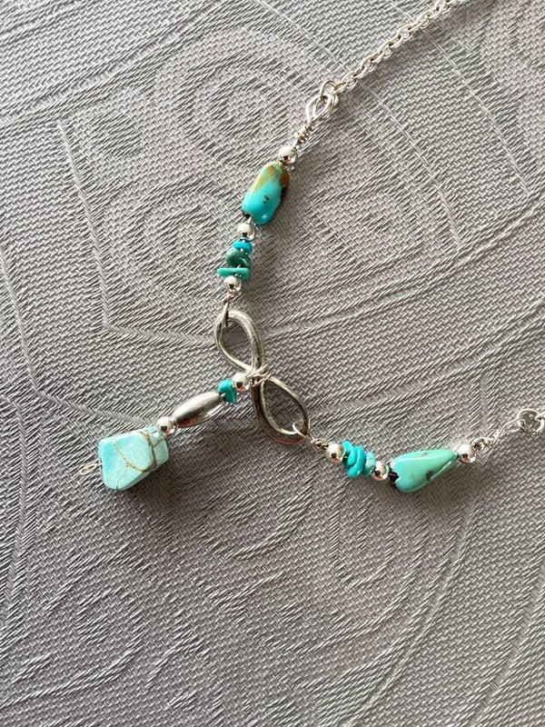 Plusieurs pierres de turquoises véritables pour ce joli collier. La chaîne est en métal argenté. Le fermoir est classique.