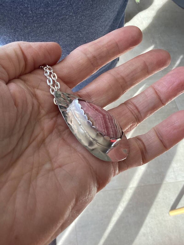 Long collier avec une belle rhodochrosite (3x2cm) sertie sur une plaque en argent 925. La chaîne est en métal argenté.
